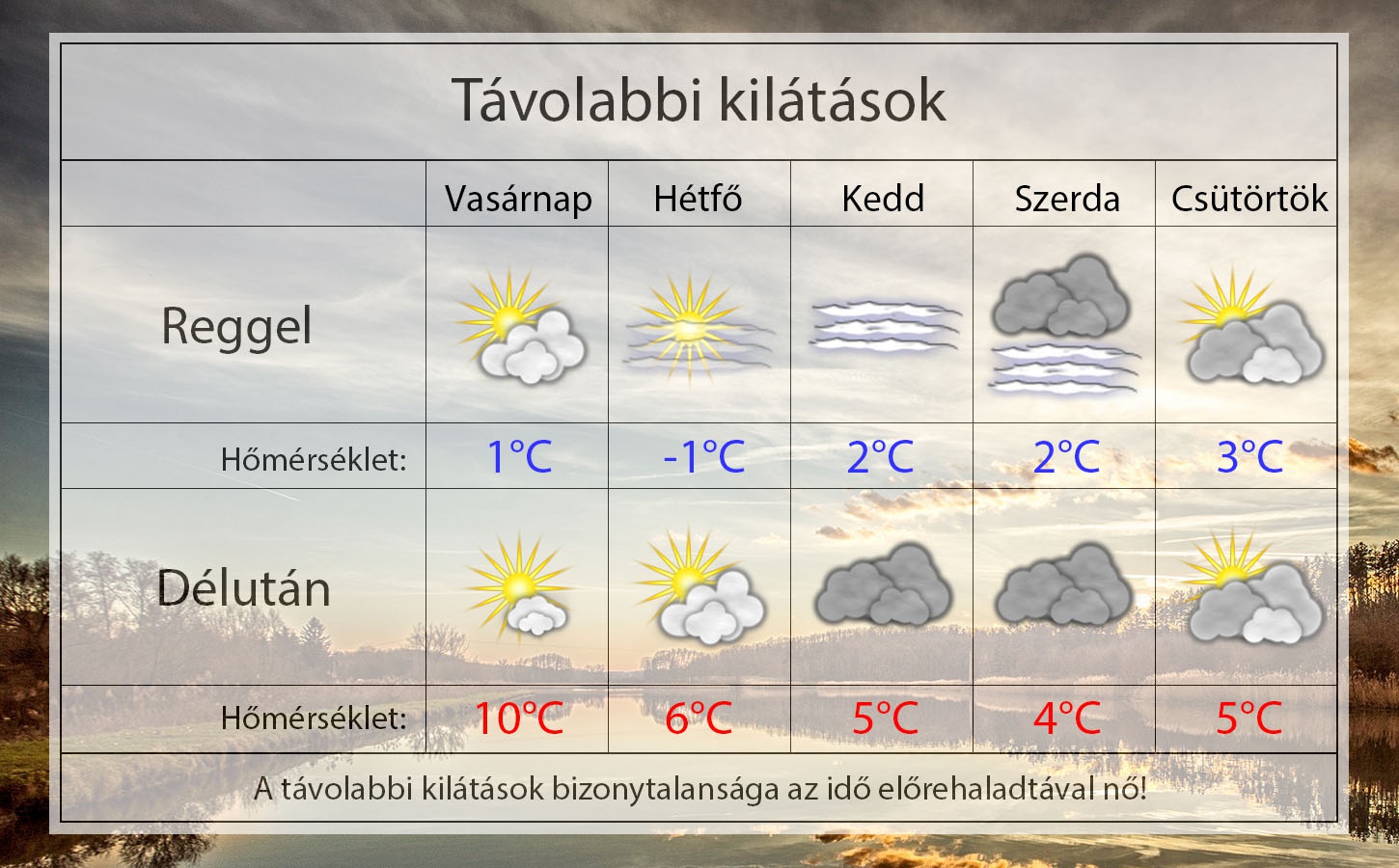 Vasárnap reggel 1°C-ig hűl a levegő a közepesen felhős ég alatt. Napközben már napos idő valószínű, gyengén felhős éggel. Délután 10°C-ig melegszik a levegő a gyenge északkeleti szélben.