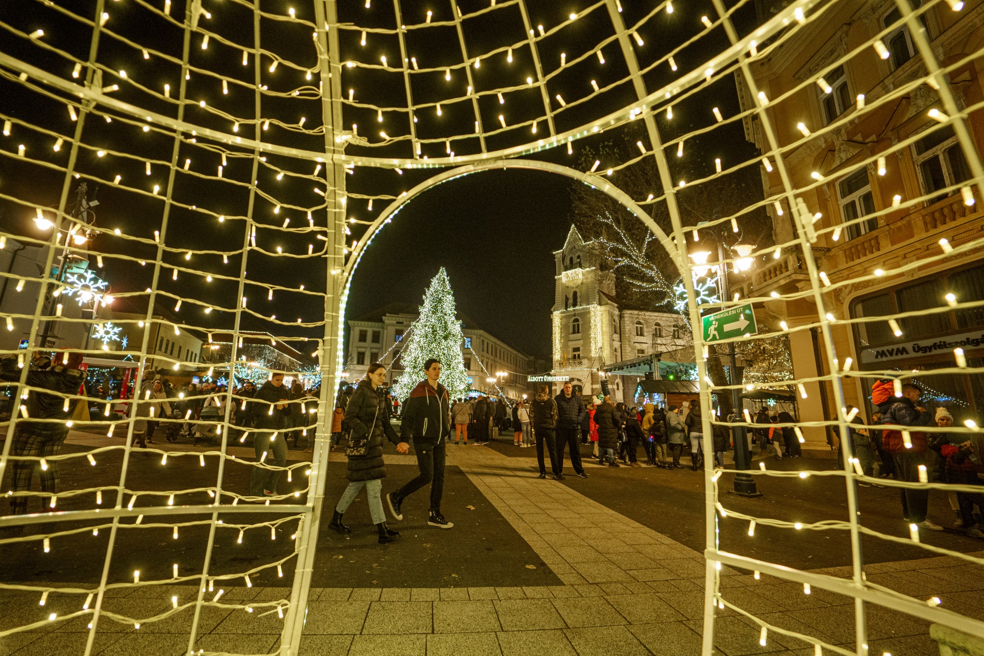 Karácsonyi fényekbe öltözött Kaposvár belvárosa. Advent első vasárnapján kapcsolták fel a város ünnepi díszkivilágítását, az ünnepségre hatalmas tömeg gyűlt össze a Kossuth téren.