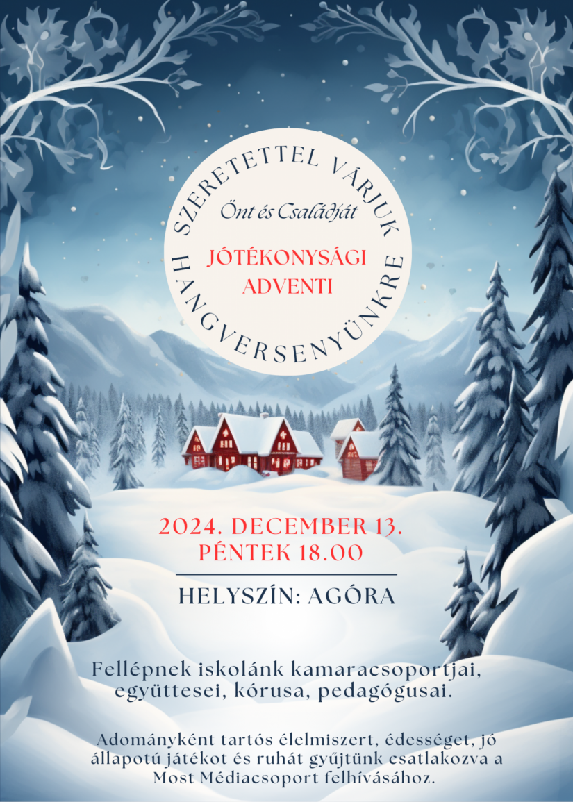 Szombaton a Pajtaszínházban lépnek fel a zeneiskola növendékei, december 13-án pedig adventi jótékonysági hangversenyt tartanak az Együd Árpád Kultúrális Központban, ahol fellép majd az iskola kamaracsoportjai, együtteseik, a kórusok és a pedagógusok. Az eseménnyel a zeneiskola a Most Médiacsoport adventi adománygyűjtéséhez is csatlakozik, így az adakozóktól tartós élelmiszert, édességet, jó állapotú ruhát és játékokat várnak.