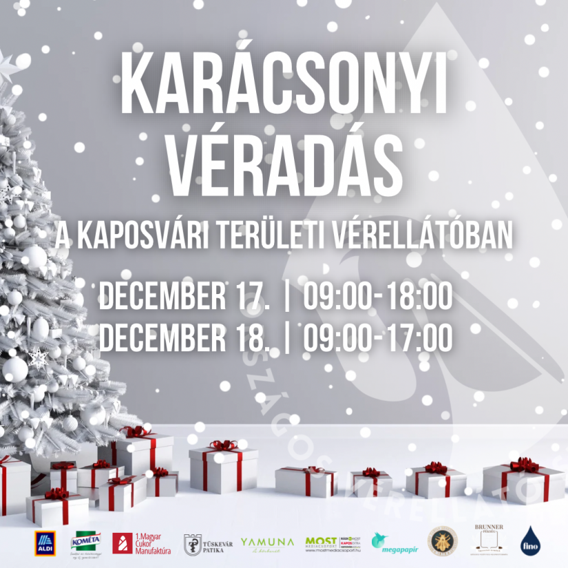 A karácsonyi véradásra december 17-én 9:00-től 18:00 óráig, december 18-án pedig 9:00-től 17:00 óráig várják a véradókat Kaposváron a Tallián Gyula utca 20-32-ben.