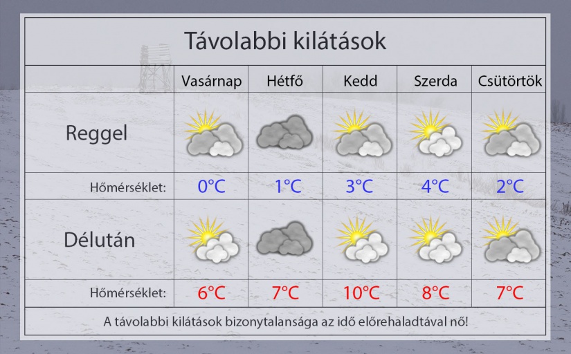 Vasárnap reggel 0°C-ig hűl a levegő az erősen felhős ég alatt. Napközben csökken a felhőzet és megélénkül az északnyugati szél. Délután 6°C-ig melegszik a levegő.