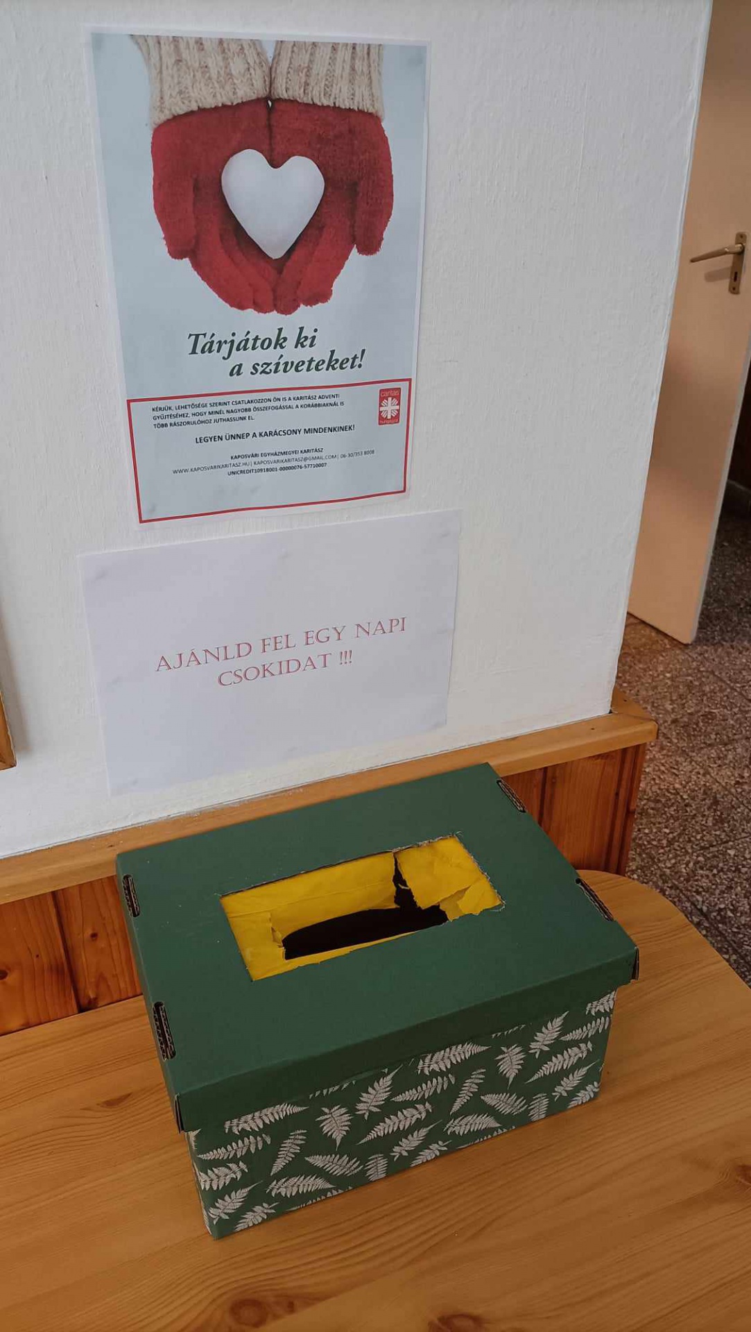 A több évre visszanyúló, már hagyományos gyűjtés egy kis szünetet követően idén ismét megszervezésre került. – A főbejárat közelében helyeztük el a gyűjtést hirdető plakátot, alá pedig azt a dobozt, amibe a gyerekek és a szülők beletehetik az általuk felajánlott édességeket. A gyűjtés lényege, hogy a gyerekek egy napi csoki adagjukat tehetik a dobozba.