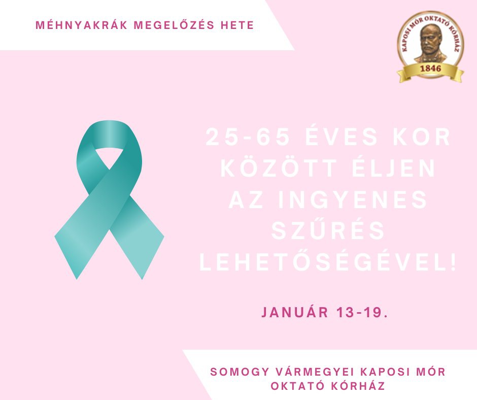 Az Európai Méhnyakrák Megelőzési Hét keretében a Kaposi Mór Oktató Kórház 2025. január 13. és 19. között ingyenes szűrővizsgálatokat kínál a megelőzés jegyében. A méhnyakrák rendszeres szűréssel és védőoltással időben felismerhető, így hatékonyan gyógyítható.
