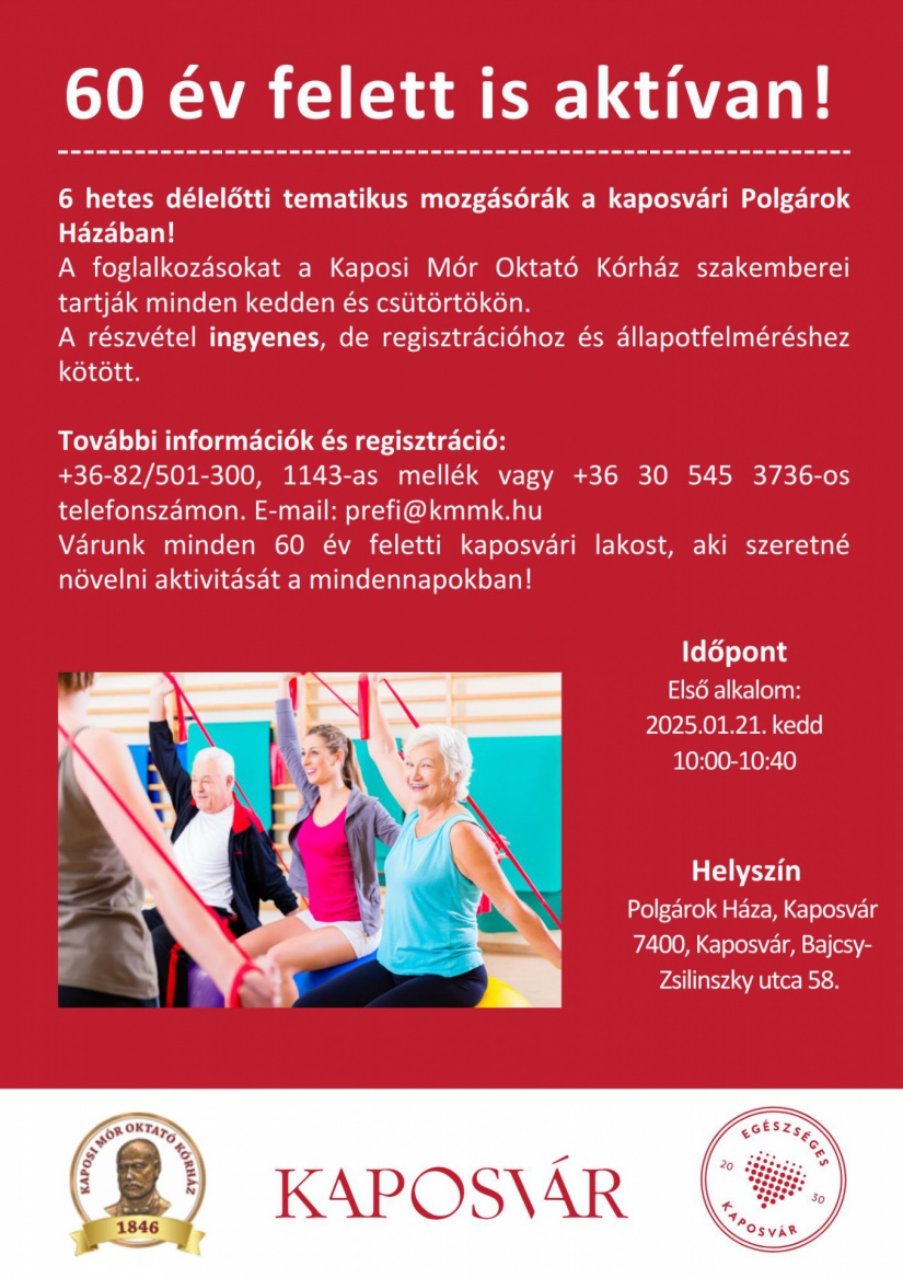 Hat héten át tartó, ingyenes délelőtti mozgásórákat szervez a Kaposi Mór Oktató Kórház 60 év feletti kaposvári lakosok számára. A program az Egészséges Kaposvár 2030 program részeként valósul meg.