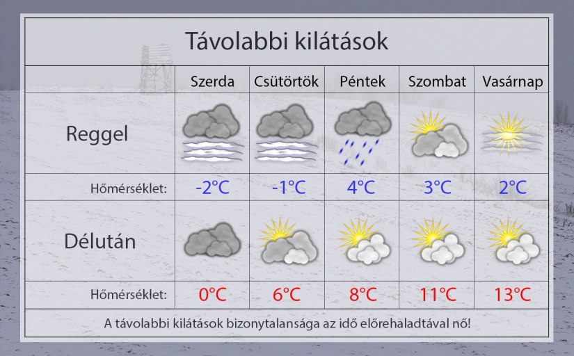 A hét második felében csütörtökön megélénkül a délnyugati szél és ezáltal felszakadozik a ködfelhőzet. Kisüthet a nap is. Megenyhül időjárásunk. A hétvégén koratavaszias, napos idő várható. Napról napra melegebb lesz majd, így a hétvégén már 10°C feletti maximumok is esélyesek, valamint a fagyok is gyengülnek majd.