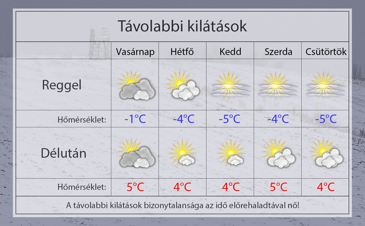 A jövő héten eseménytelen, a hőmérsékleteket tekintve pedig télies idő várható csapadék nélkül.Reggelente foltokban köd képződhet, míg napközben közepesen felhős ég mellett azért süthet a nap.