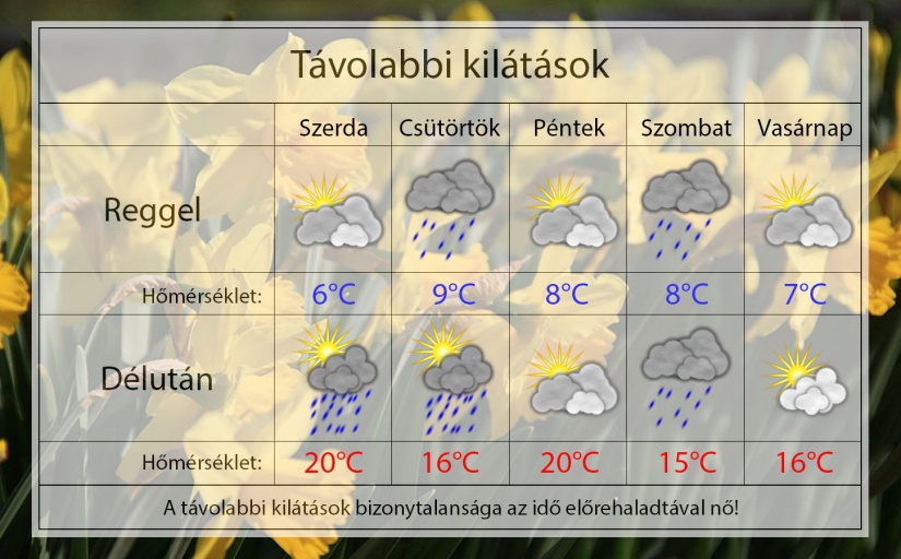 A hét második felében kissé szelessé válik időjárásunk. Ismétlődő jelleggel bármikor lehet záporeső. Hétvégére nagyobb csapadék is jöhet. Reggel nem kell tartanunk fagytól, mígy napközben 15-20°C között váltakozik a hőmérséklet. Tavaszias idő várható.