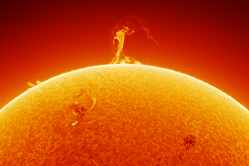 A „The Sun God” című, naprendszer kategóriájú nyertes fotón egy hatalmas eruptív protuberancia látszódik a Nap felszíne felett.
