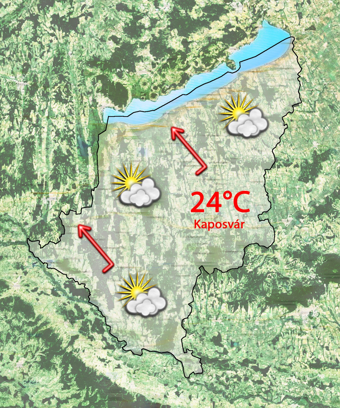 Szerdán reggel 8°C-ig hűl le a levegő a gyengén felhős ég alatt. Napközben változóan felhős ég mellett 25°C-ig melegszik a levegő délutánra. Kellemes idő várható sok napsütéssel. Gyenge lesz az északnyugati szél.