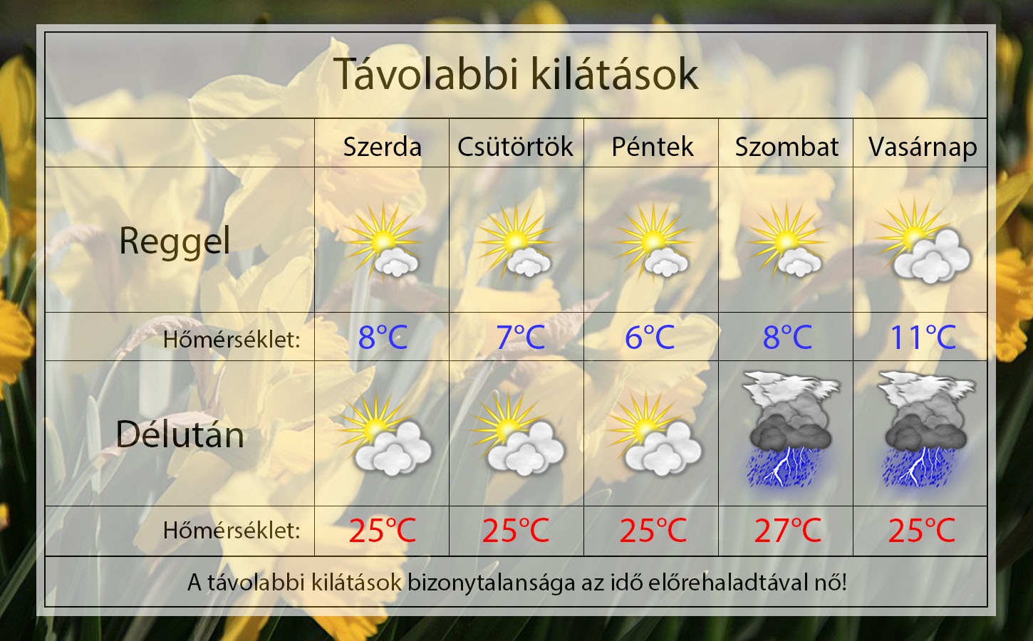 A hét második felében egy érintő hidegfront hatására feltámad kicsit a szél és lehet pár °C-os visszaesés, de továbbra is tavaszias idő várható. Reggelente 6-9°C környékére hűl a levegő, míg napközben maradnak a 24-26°C-os maximumok. Csapadékra szombaton van kilátás szórványos záporok és zivatarok formájában.
