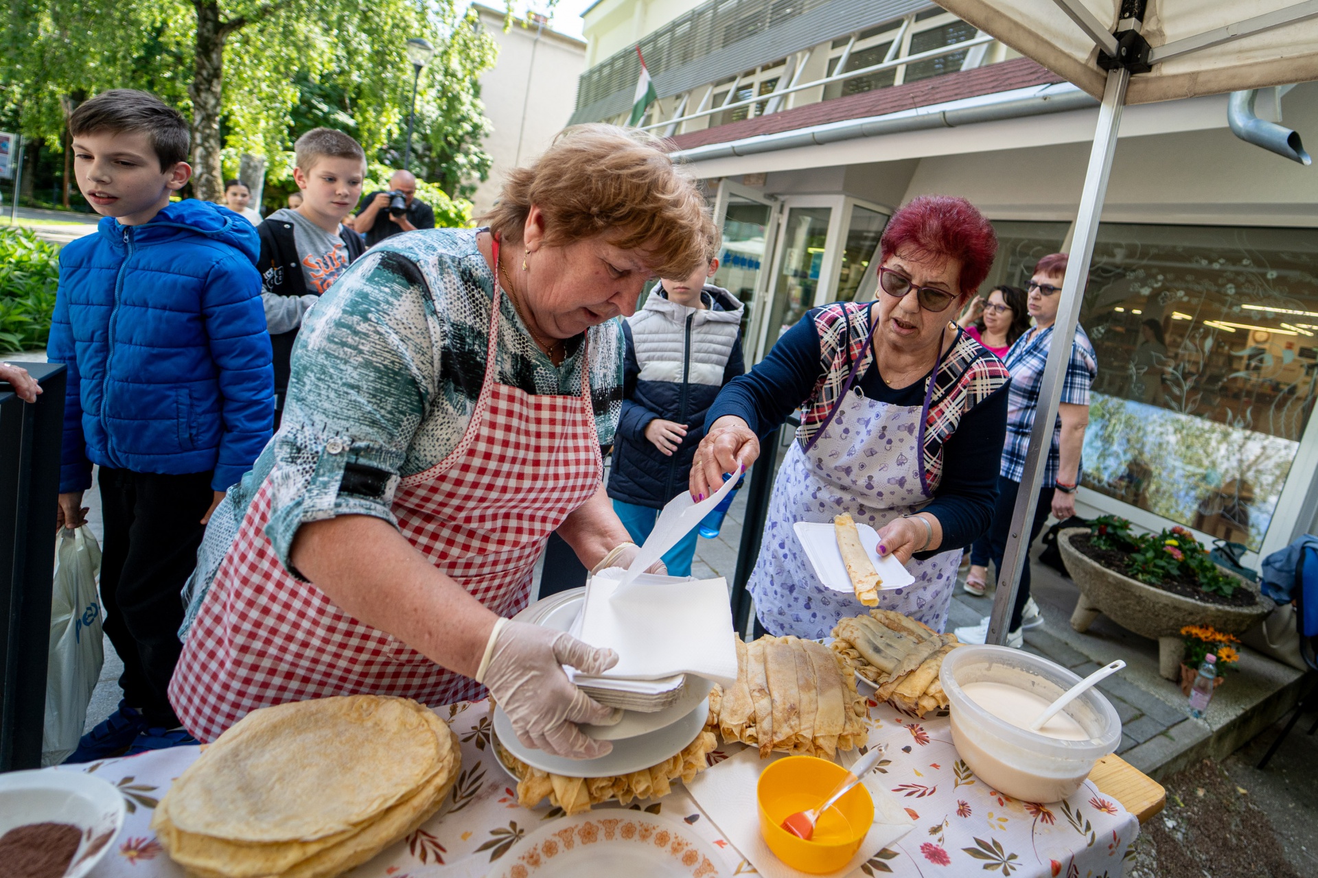 Az átadó azonban nem csak szellemi, hanem kulináris élményt is kínált: a könyvtár előtti téren a Toponárért Nyugdíjasok Egyesületének önkéntesei 300 darab ízes és kakaós palacsintát sütöttek, amit a gyerekek és minden jelenlévő örömmel fogyasztott el.