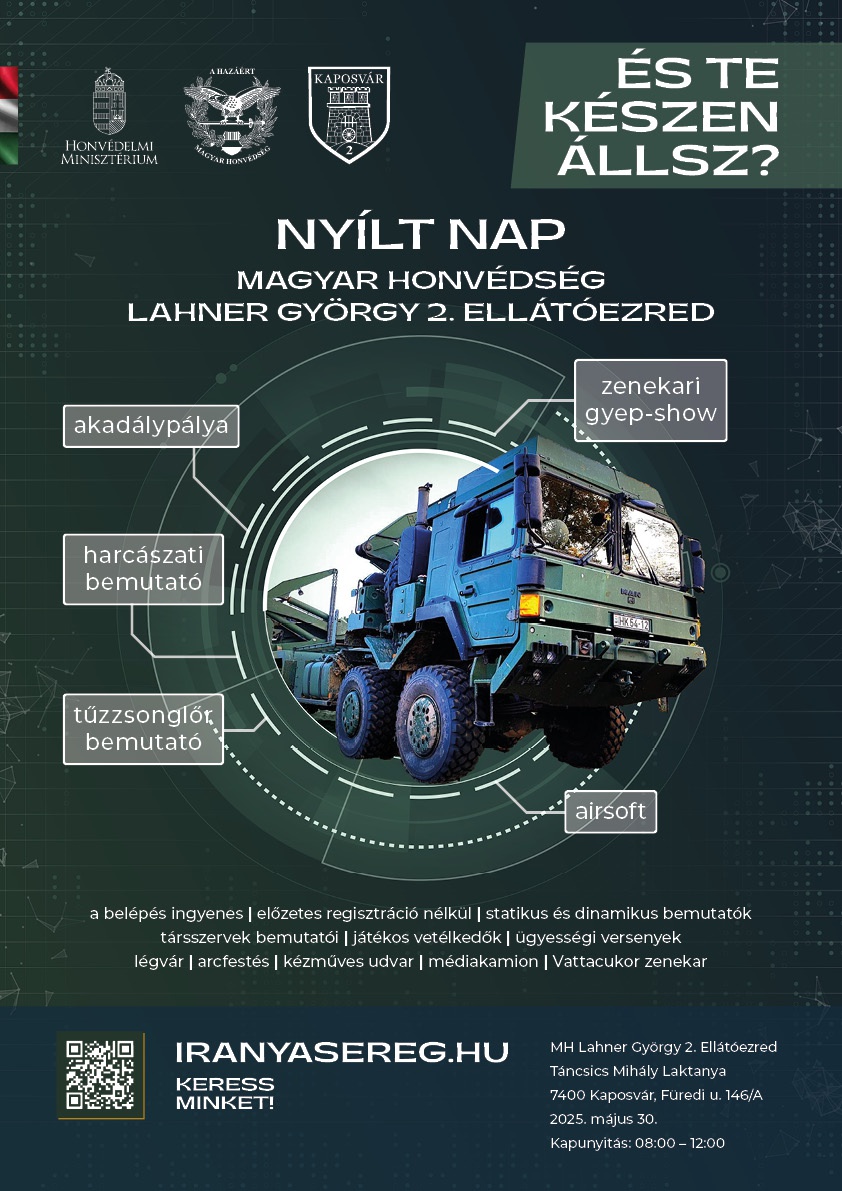 Május 30-án, vagyis ezen a héten pénteken nyílt napot szervez a Magyar Honvédség Lahner György 2. Ellátóezrede a kaposvári Táncsics Mihály Laktanyában. Az érdeklődőket akadálypálya, harcászati bemutató, airsoft, tűzzsonglőr show és zenekari gyep-show is várja.
