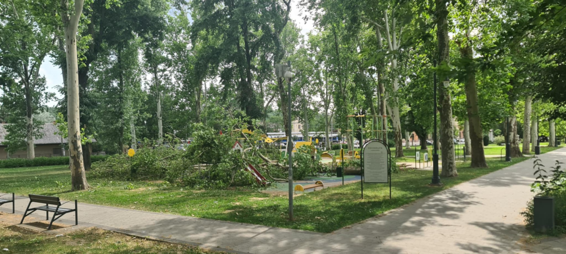 Vasárnap délután az erős szél kettétört egy platánfát a Színház parkban, ami aztán a játszótér egy részére dőlt, jelentős károkat okozva – derül ki egy Facebook-bejegyzésből. Mint írják, a szerencsének köszönhető, hogy a játszótéren éppen nem tartózkodott senki. A helyszínen a tűzoltók megkezdték a kárenyhítést.