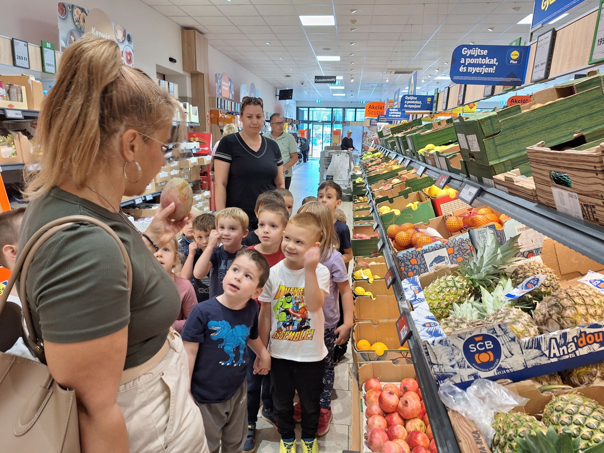 A Búzavirág tagóvoda egyik csoportja különleges kiránduláson vett részt szerdán: ellátogattak a közeli bevásárlóközpontba, hogy testközelből ismerkedjenek a zöldségekkel és gyümölcsökkel. A program a játékos tanulási lehetőség mellett közös élményt is nyújtott a gyerekeknek.