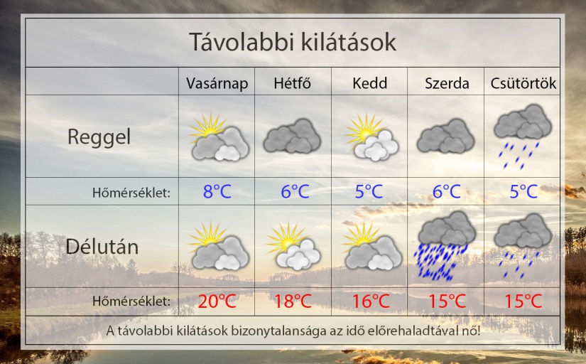 Vasárnap 8°C-ig hűl a levegő a hajnali órákra az erősen felhős ég alatt. Napközben is sok felhő lesz az égen de szűrt napsütésre is számíthatunk. 20°C-ig melegszik a levegő. Gyenge északi szél fog fújni.