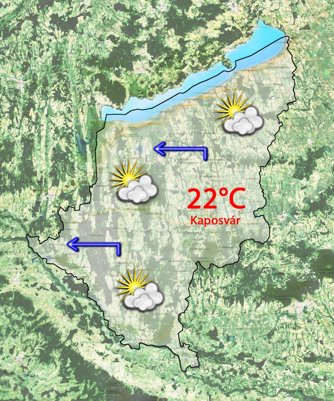 Szombat reggelre 12°C-ig csökken a hőmérséklet az erősen felhős ég alatt. Napközben változóan, olykor erősen felhős lesz az ég és néhol kisebb zápor is kialakulhat. Kellemes, nyugodtabb idő lehet 22°C-al és gyenge keleti széllel.