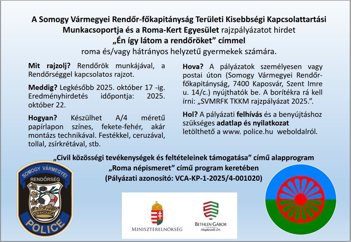 A Somogy Vármegyei Rendőr-főkapitányság Területi Kisebbségi Kapcsolattartási Munkacsoportja különleges rajzpályázatot hirdetett meg 7 és 14 év közötti, hátrányos helyzetű és/vagy roma származású gyermekek számára - írja a Police.hu.