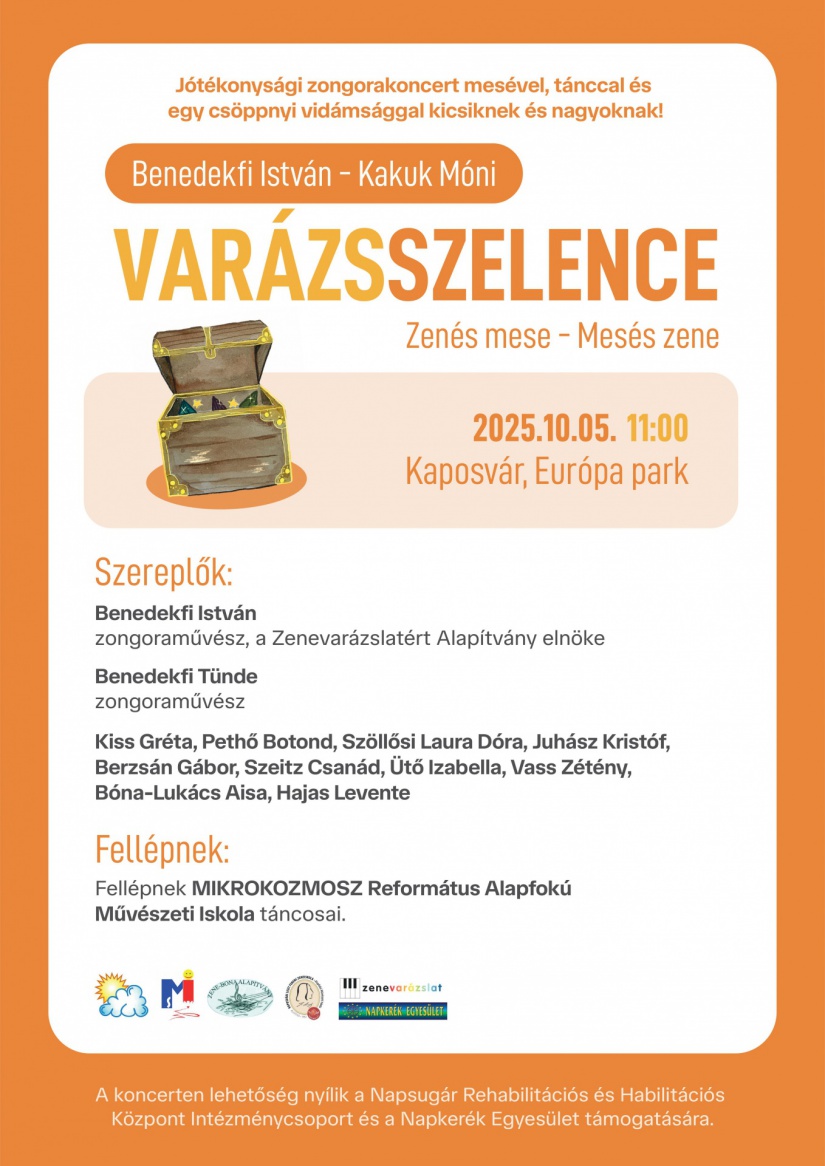 A „Varázsszelence” című művészeti projekt célja, hogy játékos módon hozza közelebb a klasszikus zenét a fiatalokhoz. A darab alapját Benedekfi István zeneszerző gyerekeknek írt négykezes zongoraciklusa adja, amelyhez Kakuk Móni meséje kapcsolódik.