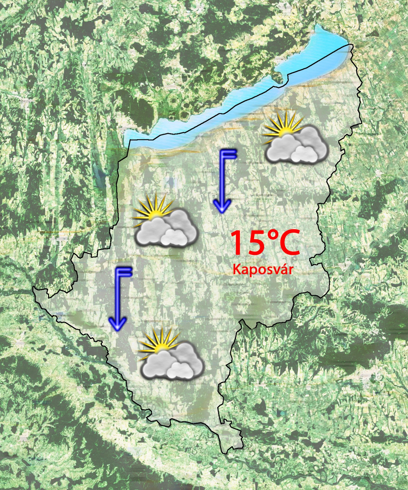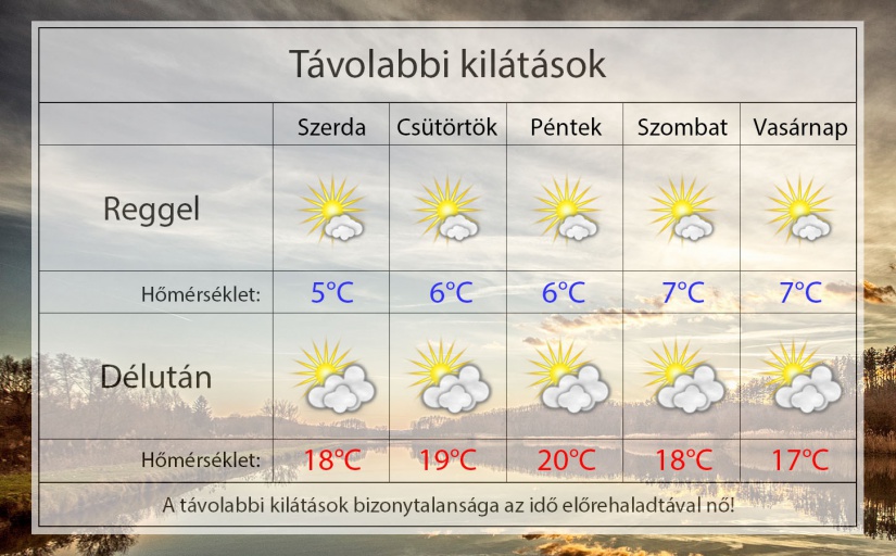 Szerdán reggel a közepesen felhős ég alatt 5°C-ig hűl le a levegő. Napközben közepesen felhős lesz az ég és 18°C-ig melegszik a levegő. Továbbra is északi szél fúj majd.