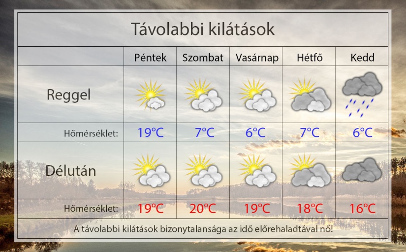 A hétvégén nyugodt idő várható csapadék nélkül. Reggelente 5-8°C környékére csökken a hőmérséklet, míg napközben 18-20°C közötti maximumokra van esély. A jövő hét elején azonban ismét egy hidegfront érkezik.