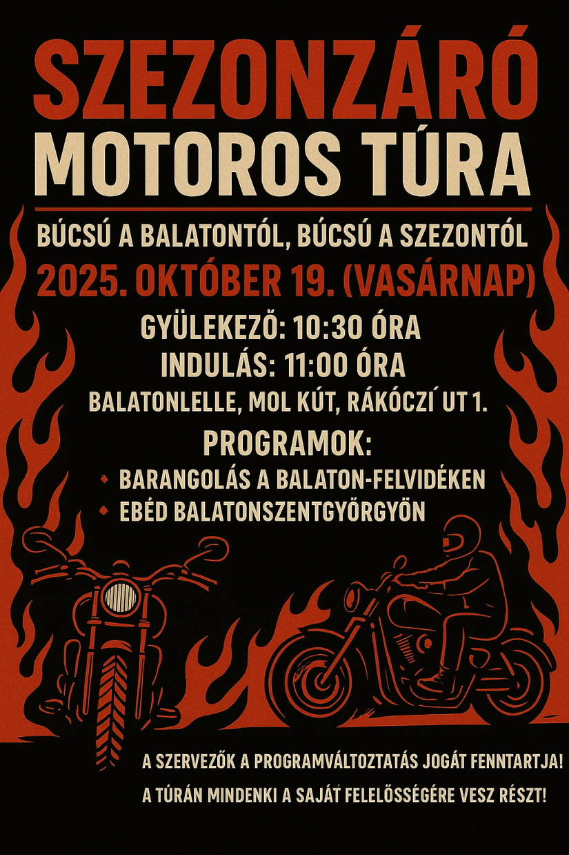 Október 19-én, vasárnap nyeregbe pattan több mint ötven motoros, hogy közösen lezárják az idei motoros szezont.