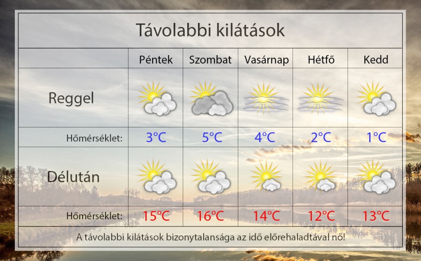 A hétvégén szombaton egy gyenge hidegfront hatására megnövekszik a felhőzet és megélénkül az északi szél de csapadékra nem kell számítani. Vasárnap megint nyugodtabb idő várható. Komolyabb lehűléstől nem kell tartani de sajnos csapadék se nagyon lesz. A reggelek hűvösek lesznek 3-5°C-al. Délutánonként pedig 15°C körül alakul a maximum.