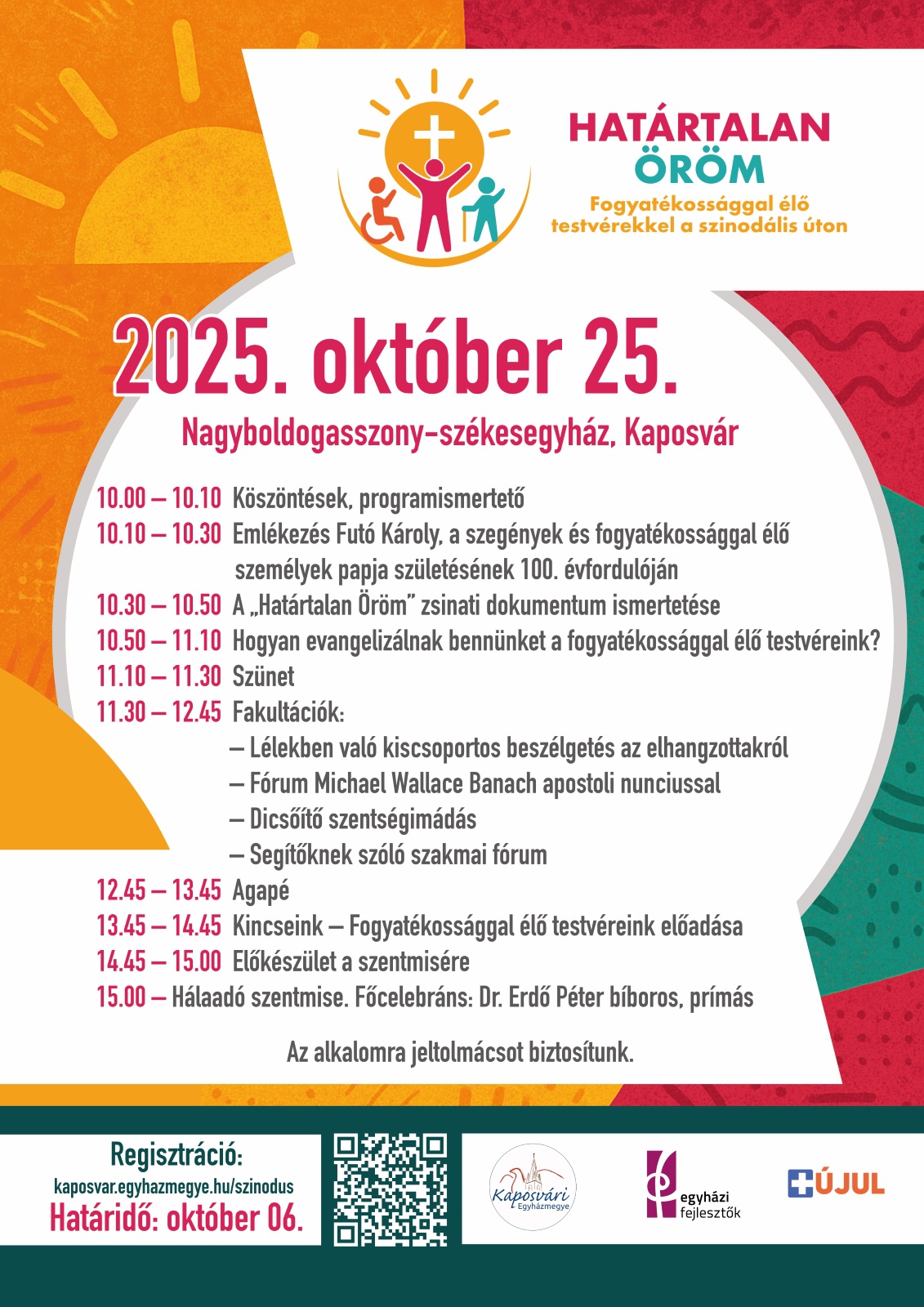 Október 25-én, szombaton „Határtalan öröm” címmel ünnepi konferenciát szervez a Kaposvári Egyházmegye fogyatékossággal élő személyek, segítőik és családtagjaik számára Kaposváron.