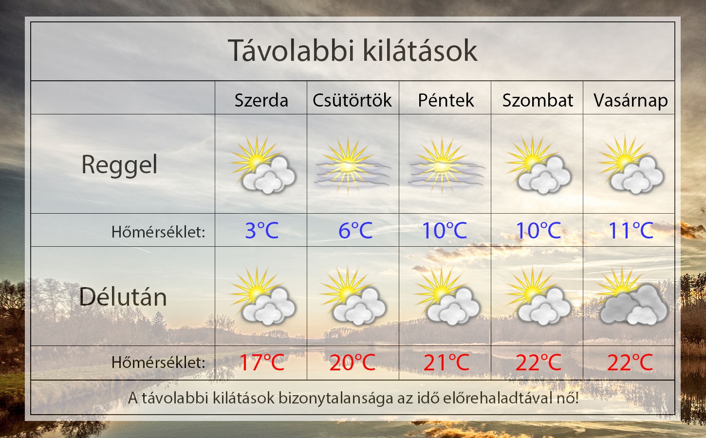 Szerdán reggel a közepesen felhős ég alatt 3°C-ig hűl le a levegő. Napközben változóan felhős lesz az ég és 17°C-ig melegszik a levegő. Gyenge délnyugati szél fúj majd.