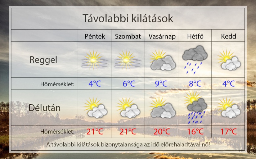 Pénteken reggel gyengén felhős lesz az ég de többfelé képződhetnek köd és párafoltok. 4°C-ig csökken a hőmérséklet. Délután kellemes, napos idő várható. 21°C-ig melegszik a levegő a délutáni órákra. A szél délkelet felől fog fújni gyengén.