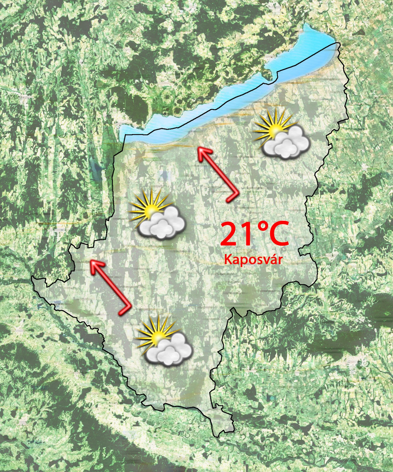 Szerdán délután gyengén felhős lesz az ég és akár többórás napsütésben is lehet részünk. Kellemes idő várható. 20°C-ig melegszik a levegő. Gyenge déli szél fúj majd.