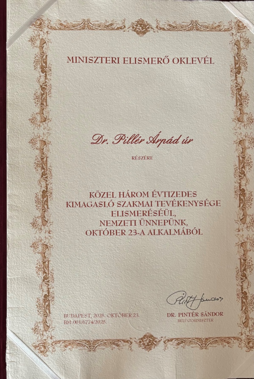 Nemzeti ünnepünk alkalmából miniszteri elismerő oklevelet vehetett át Dr. Pillér Árpád, a Somogy Vármegyei Kaposi Mór Oktató Kórház Aktív Mozgásszervi Sebészeti Centrumának vezető főorvosa – számolt be róla a kórház hivatalos Facebook-oldala.