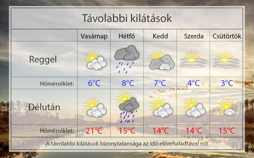 Szombat reggelre 5°C-ig csökken a hőmérséklet a gyengén felhős ég alatt. Néhol köd képződhet. Napközben változóan, fátyolfelhős lesz az ég. Kellemes idő várható 20°C-al és gyenge déli széllel.