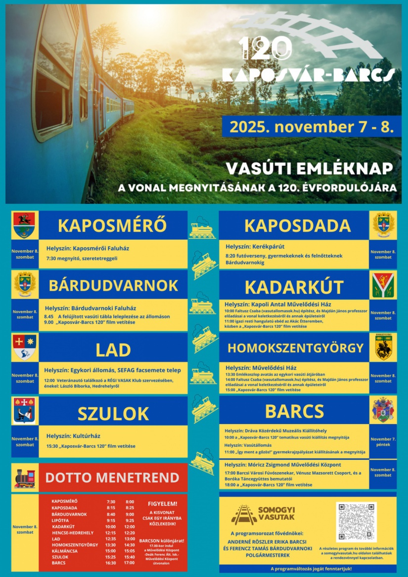 November 8-án egész napos programsorozattal emlékeznek meg a Kaposmérő és Barcs közötti vasútvonal megnyitásának 120. évfordulójáról. A 1905-ben átadott vonal 1979-ig szolgálta a térséget, most pedig ismét „élet költözik” a sínek mentén – olvasható a somogyivasutak.hu oldalon.