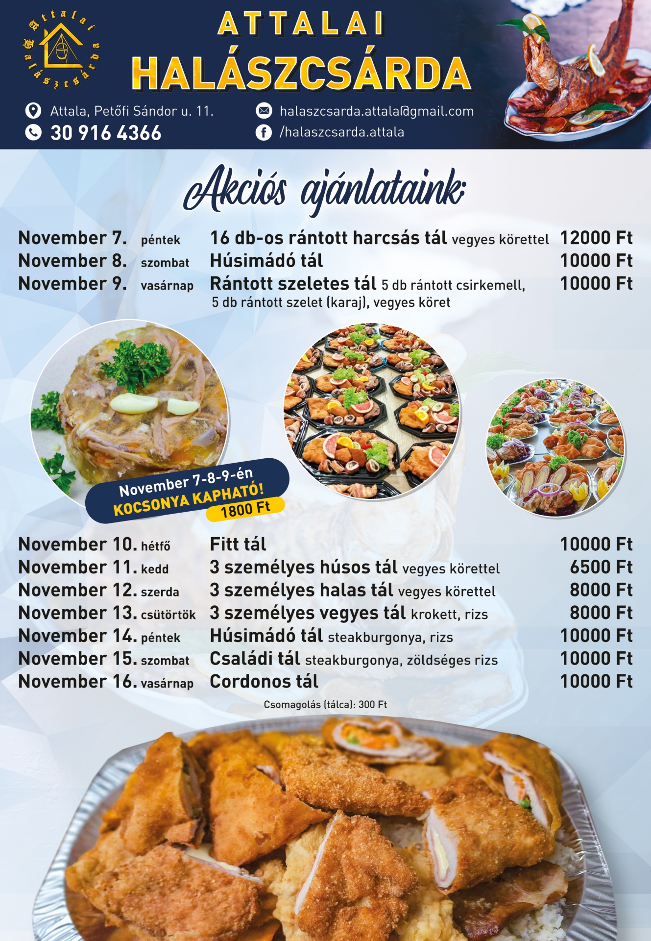 November 7. és 16. között tematikus tálakkal várja vendégeit az Attalai Halászcsárda. A kínálatban többek között harcsás tál, húsimádó tál, fitt tál és cordonos tál is szerepel. Az akció több mint egy héten át tart, és minden nap más-más összeállítással készül az étterem.