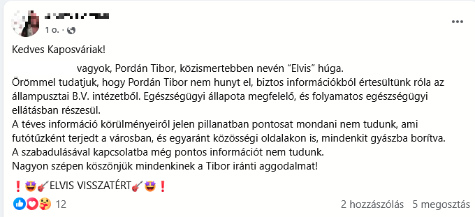 Két nappal később, pénteken Tibor húga tett közzé egy bejegyzést a közösségi oldalán, melyben azt írja: