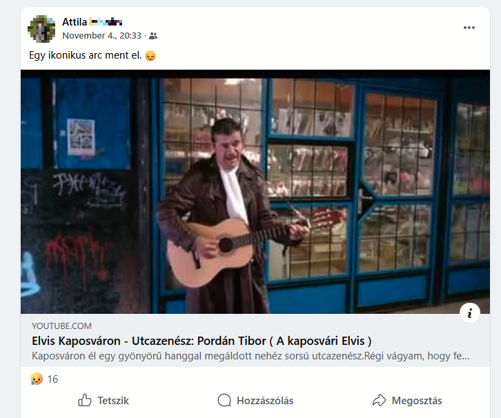 Hozzánk másnap ért el a bejegyzés, amit addigra már rengetegen osztottak meg. Egy néhány évvel ezelőtt készült Youtube-videó is újra előkerült, valaki már kedden este ezzel a felvétellel búcsúzott Pordán Tibortól.