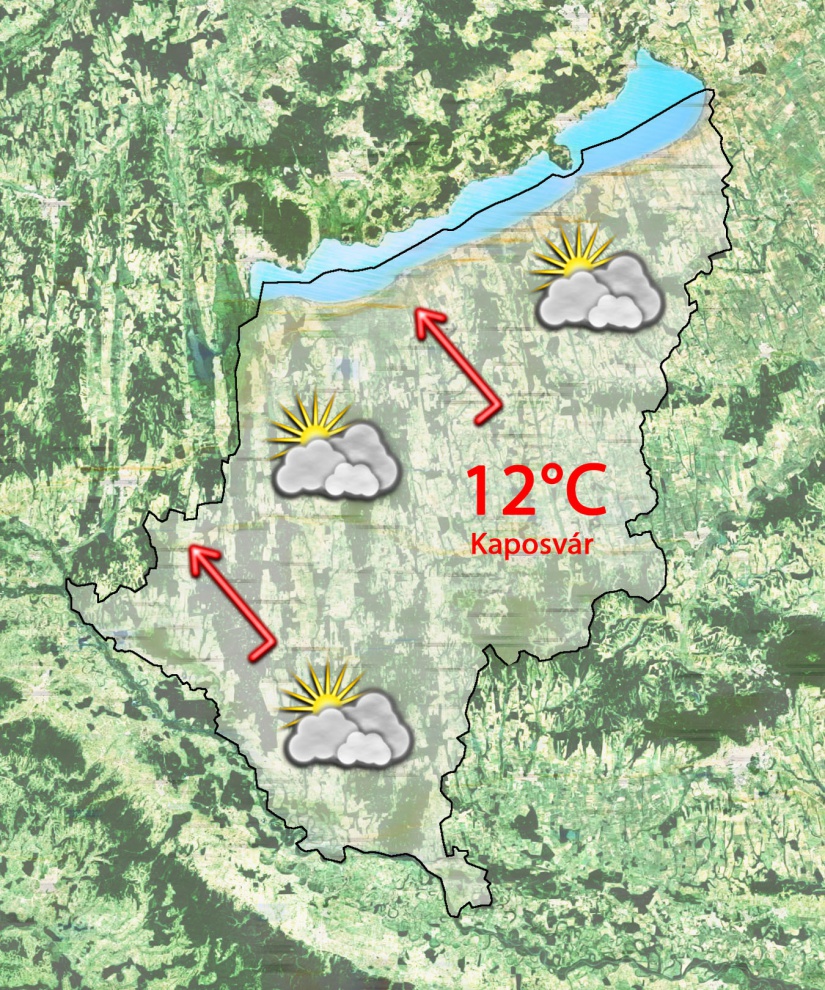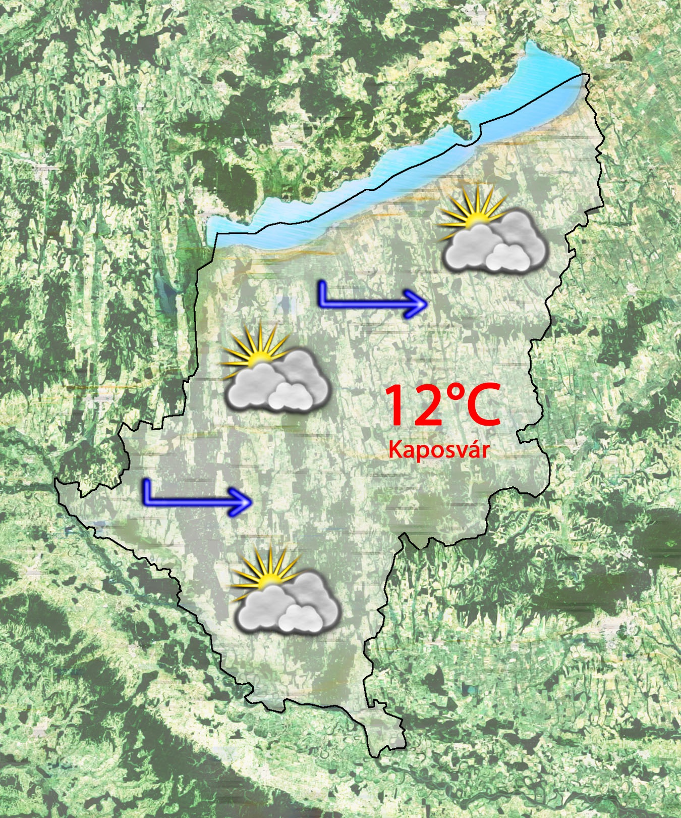 Kedd reggel 3°C-ig csökken a hőmérséklet a borongós, ködös égbolt alatt. Napközben csak nehezen oszlik fel a ködfelhőzet, ezért erősen felhős időre van kilátás. 12°C-ig kúszik fel a hőmérő higanyszála. Gyenge lesz az nyugati szél.