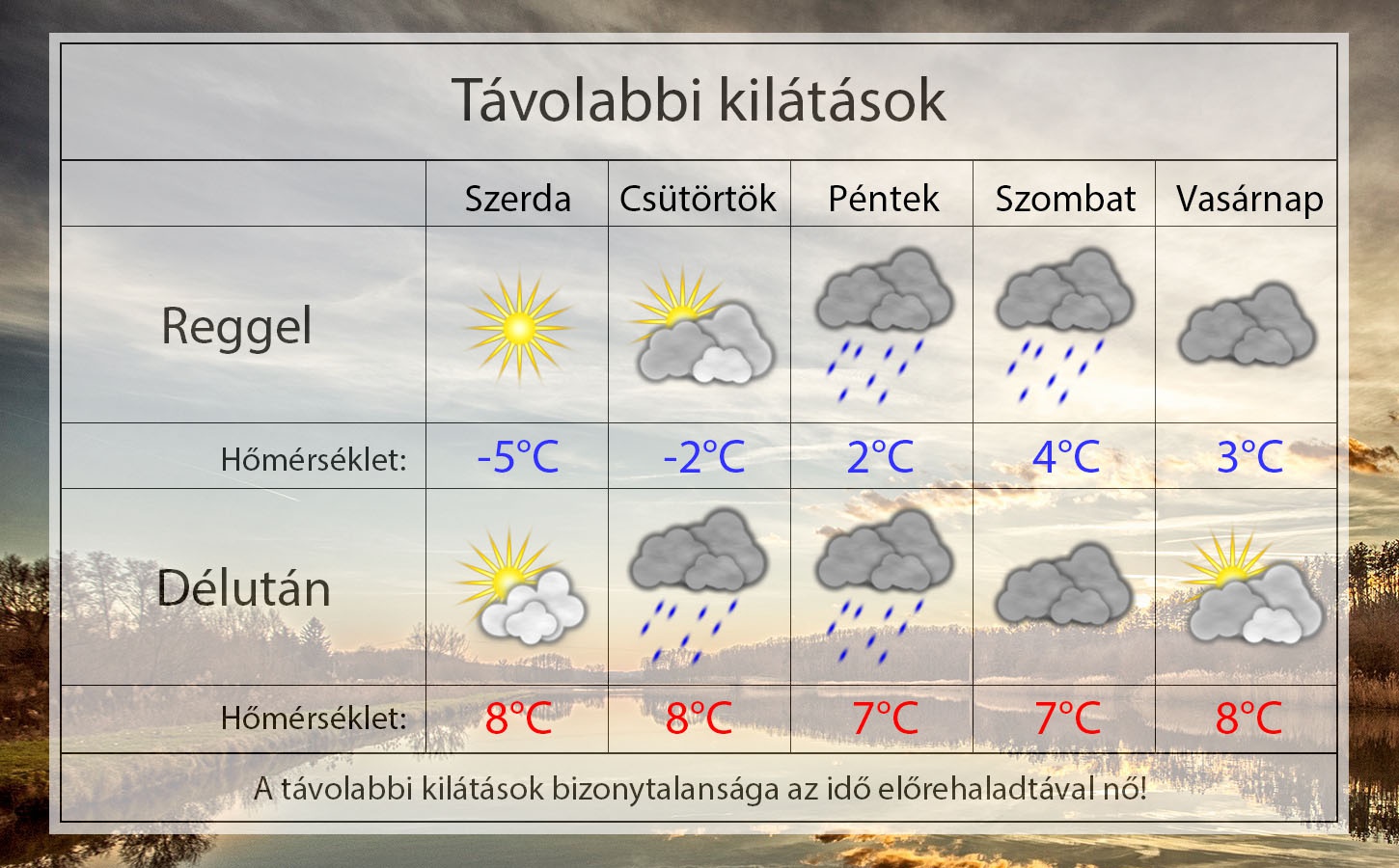 A hét második felében egy ciklon hatására felhős idő lesz időszakos csapadékkal, ám ekkor az éjszakák már fagymentesek lehetnek, de napközben hűvös idő várható 7 9°C-os maximumokkal.