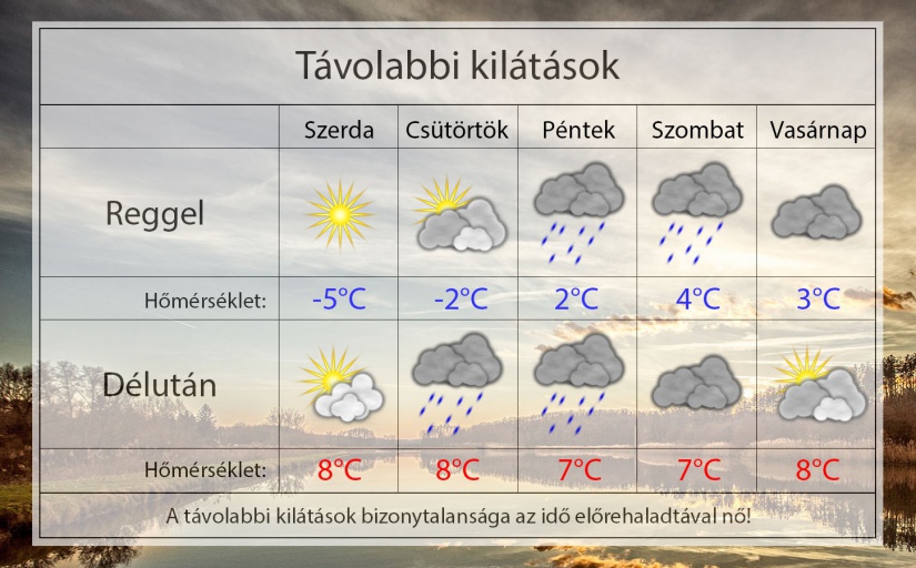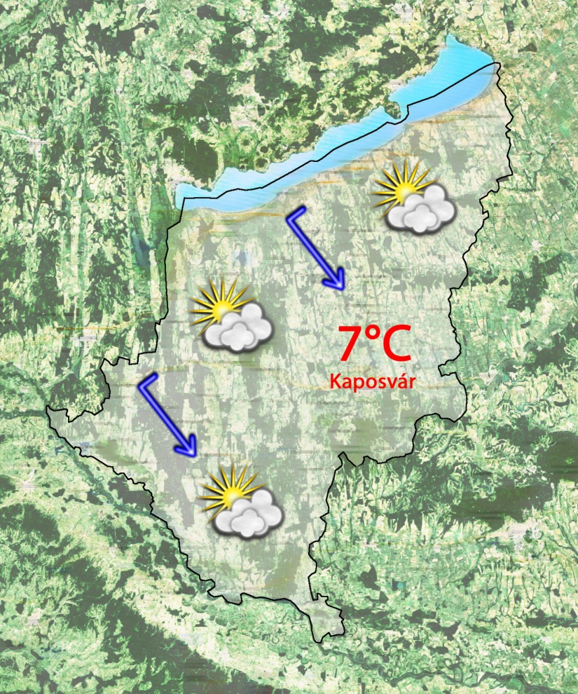 Szerdán reggel a már derült ég alatt -4°C-ig hűl le a levegő, de a völgyekben ennél hidegebb is lehet. Napközben közepesen felhős lesz az ég és csak 8°C-ig melegszik a levegő. Gyenge délkeleti szél fúj majd.