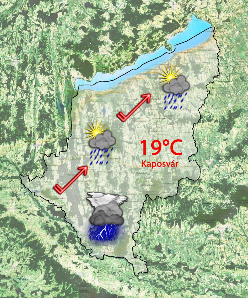 Hétfőn eleinte erősen felhős lesz az ég, majd északnyugat felől markáns hidegfront érkezik. Élénk lesz a délnyugati szél. A front előterében 19°C-ig melegszik a levegő, ám egyre több helyen törnek ki záporok, akár zivatarok is.