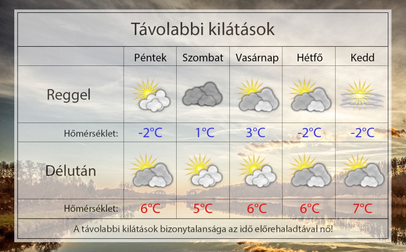 Pénteken reggel gyengén felhős lesz az ég és emiatt akár fagyhat is majd. -2°C-ig csökken a hőmérséklet. Délután erősen felhős lesz az ég és csak 6°C-ig melegszik a levegő a gyenge északi szél mellett.