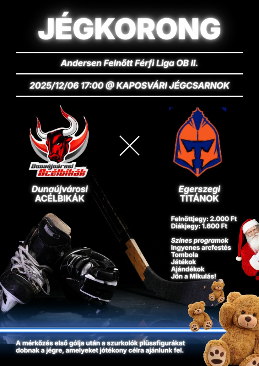 A KASI arról számolt be, hogy december 6-án, szombaton 17 órakor rendezik az Andersen Felnőtt Férfi Liga OB II. következő mérkőzését a városi Jégcsarnokban, ahol a Dunaújváros Acélbikák és az Egerszegi Titánok találkoznak. A kapunyitás 15:30-kor lesz, így a szurkolók a kezdés előtt kísérőprogramokon is részt vehetnek.