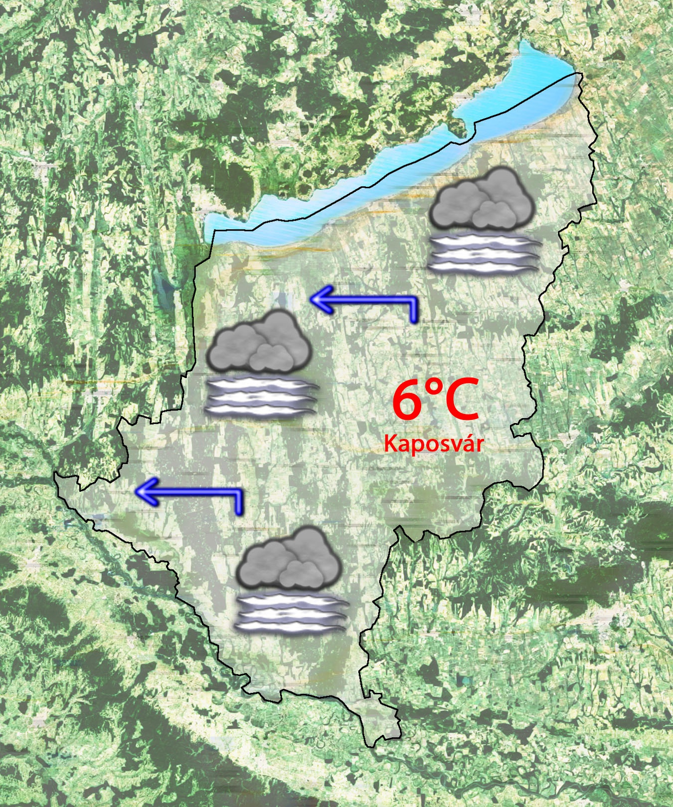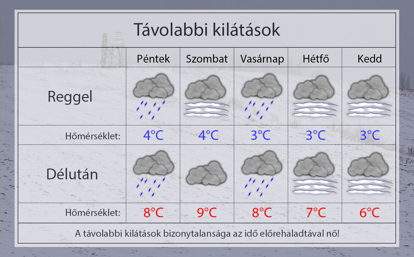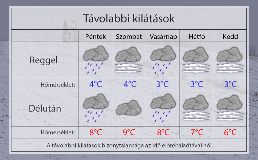 Pénteken reggel 4°C-ig hűl le a levegő a borult időben. További gyenge esőzésre, csepergésre lehet számítani. Napközben is marad a borongós, csapadékos idő. 8°C-ig melegszik a levegő. Gyengén fújhat a délkeleti szél.