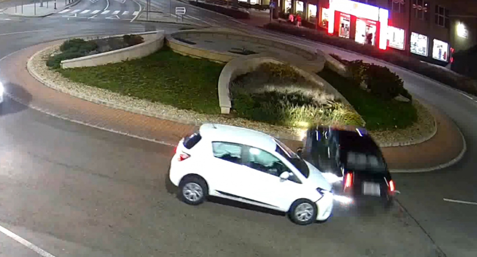 A körforgalomban két autó ütközött, és az ütközés erejét jól mutatja, hogy az egyik jármű irányíthatatlanná vált, és a járdaszegélyen áthaladva a körforgalom belső részén állt meg.