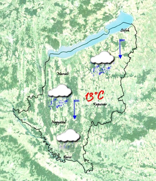 Szombaton reggel egy hidegfront érkezik és egyre többfelé ered el az eső. A 10 °C-ban a gyenge déli szél átfordul északiba. Napközben is sok lesz a felhő és bármikor lehet eső, zápor. Legtöbb csapadékra a megye nyugati részén kell számítani. A nappali felmelegedés erősen mérséklődik. Már csak 13 °C-ot mérhetünk maximumként.