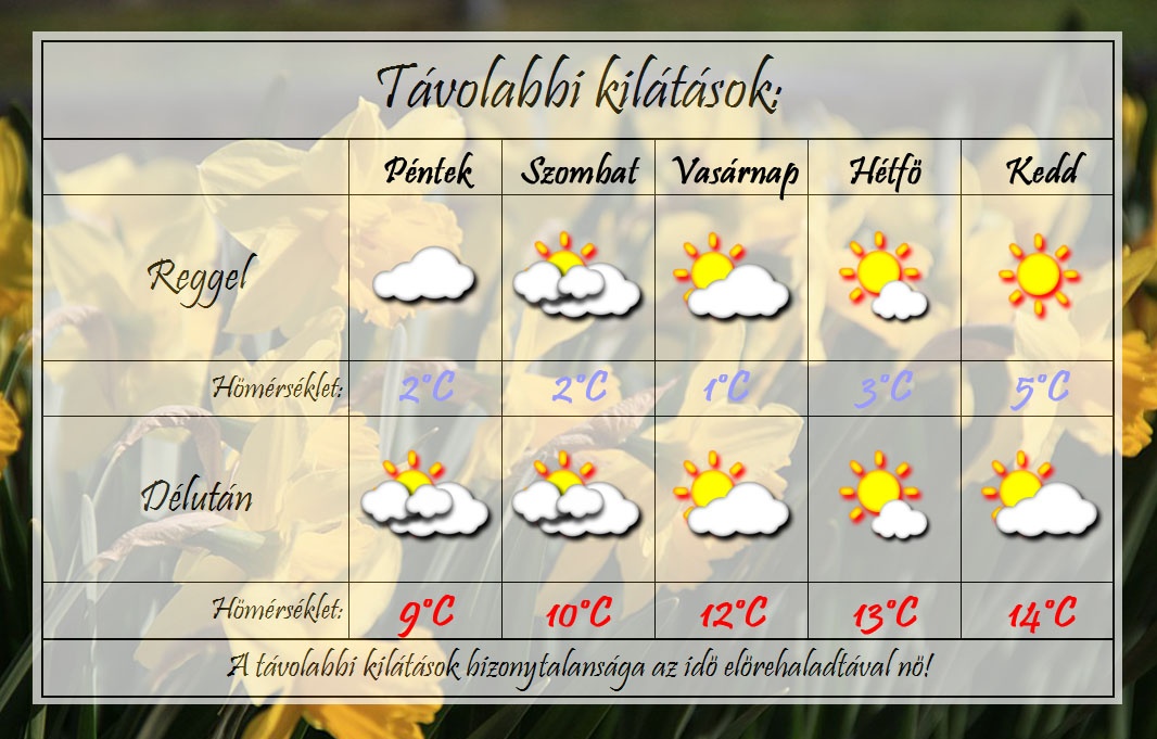 A hétvégén javuló tendenciába vált az időjárás. Egyre többet fog sütni a nap és egyre magasabb lesz a délutáni csúcshőmérséklet. A reggeli hidegek eleinte hűvösek lesznek, majd enyhülnek. A jövő héten már 15 °C-ig is kúszhat a hőmérő higanyszála a beáramló meleg levegő hatására.