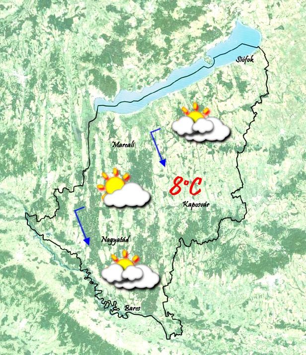 Pénteken reggel még mindig borult lesz az ég felettünk. 2-3°C-ig süllyed a hőmérséklet a hajnali órákra, míg napközben 7-8°C lesz. A délutáni órákra kissé csökken a felhőzet, de még mindig erősen felhős-borult idő várható. Az északi szél ereje gyengül, de még lehetnek érezhetően élénk széllökések.