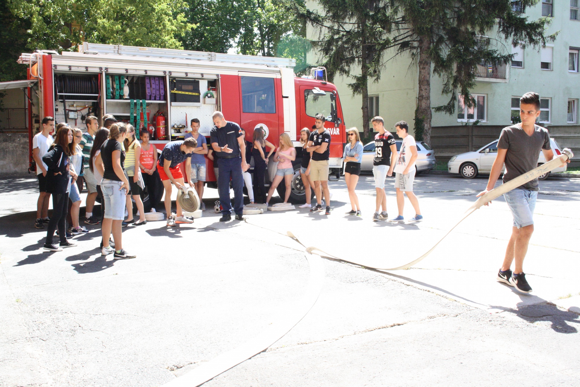 A keddi napon Vinkler Péter tűzoltó főhadnagy, szolgálatparancsnok részletesen beszélt a fiataloknak a tevékenységirányítási központ működéséről, a segítségkérés módjáról és a tűzoltók riasztásáról. A gyakorlati órán szerelési ismereteket szereztek a diákok és betekintést nyertek a tűzoltó szakfelszerelések használatába. A következő gyakorlati foglalkozásokon a tűzoltók bemutatják a tűz tulajdonságait és az oltás közben fellépő jelenségeket is a 29 középiskolásnak.