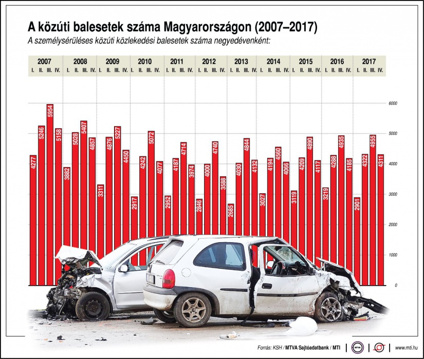 A közúti balesetek számát illetően, már nem ilyen egyértelmű a statisztika, hiszen évről-évre változik a tendencia. A legrosszabb év az elmúlt évtizedben a 2007-es volt. Akkor az első negyedévben 4277, a másodikban 5246, a harmadikban 5954, a negyedikben pedig 5158 közúti baleset történt, ami 20635 közúti balesetet jelentett. A tavalyi év első negyedévében 2901, a második negyedévben 4322, a harmadikban 4955, a negyedikben pedig 4311 közúti baleset történt a magyar utakon. Ez 16489 balesetet jelent a teljes évre.