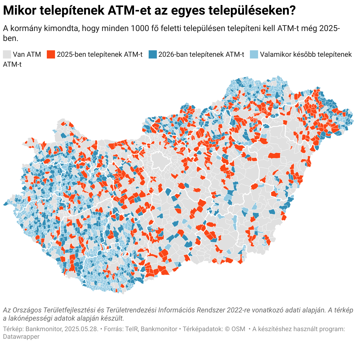 A Bankmonitor szakértői szerint 2022-ben hazánk 3155 településéből 2351-ben nem működött bankautomata. Az akkori adatok alapján 1320 olyan település volt, ahol a lakosság száma meghaladta az ezret, ám közülük 563 helyen nem volt ATM. Ha azóta nem történt jelentős változás, ezekre a településekre kerülhetnek automaták az idei év során.